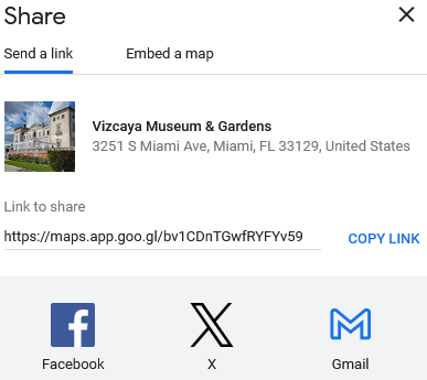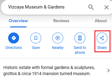 After tapping on the indicated site we need to reach or want to share, a screen is presented with many details such as the exact address, the rating other users have given, directions, and more. Right in the middle are some action options, including “Share” (it’s the last one to the far right). We have to press that button to move on to the final step.
